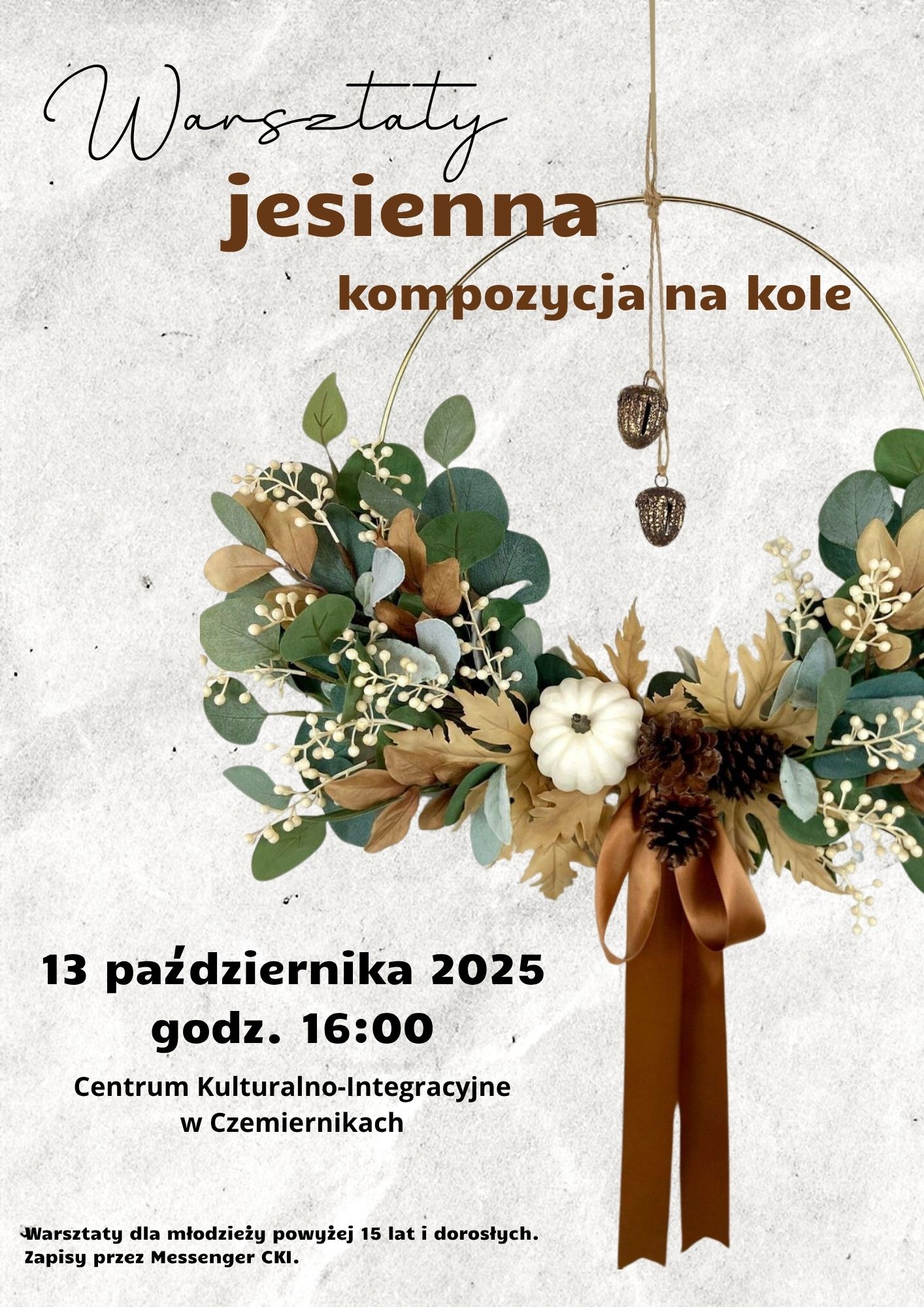 Data paź 13 2025 Czas 16:00 - 18:00 Warsztaty jesienne Zachecamy do wziecia udziału w warsztatach jesienna kompozycja na kole. Szczegóły na plakacie. Poleć to wydarzenie